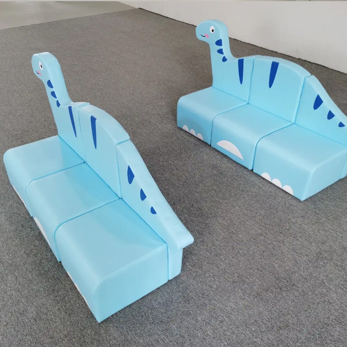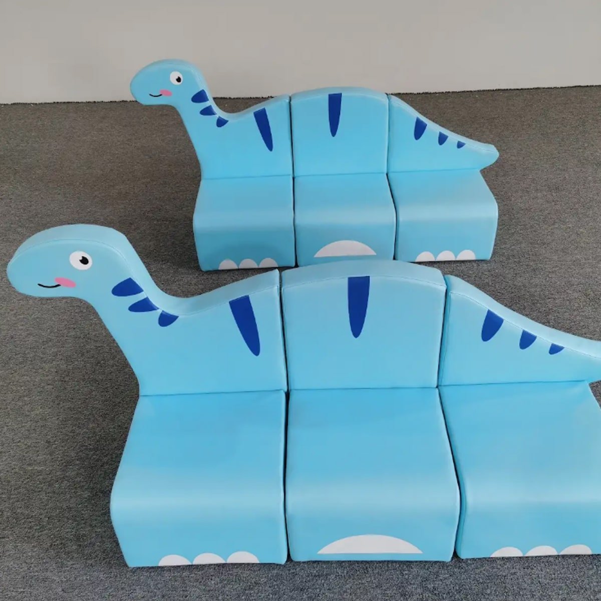 Sillón infantil modular en forma de dinosaurio, fabricado en material acolchado, seguro y colorido, ideal para áreas de juego y guarderías.