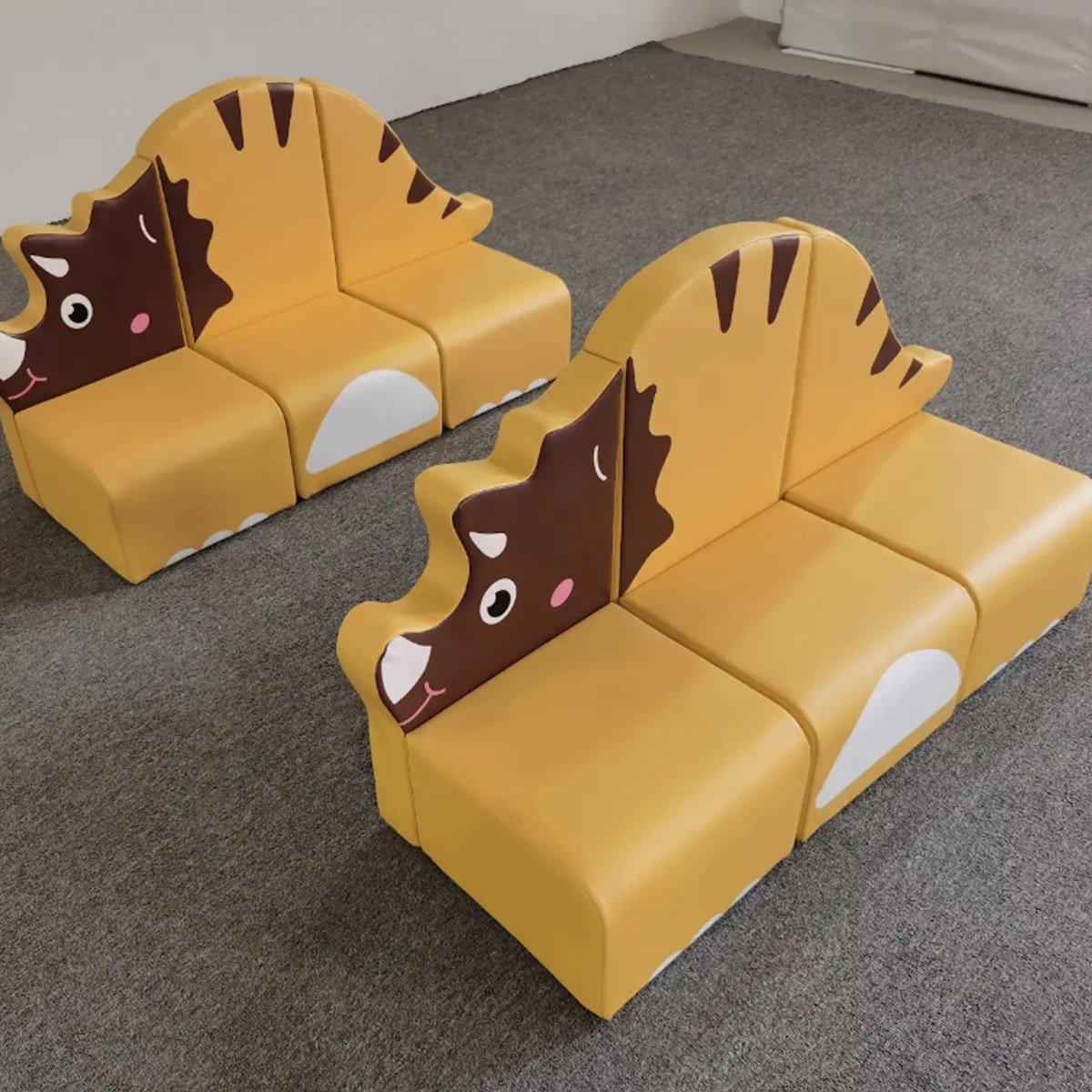 Sillón infantil modular en forma de dinosaurio, fabricado en material acolchado, seguro y colorido, ideal para áreas de juego y guarderías.
