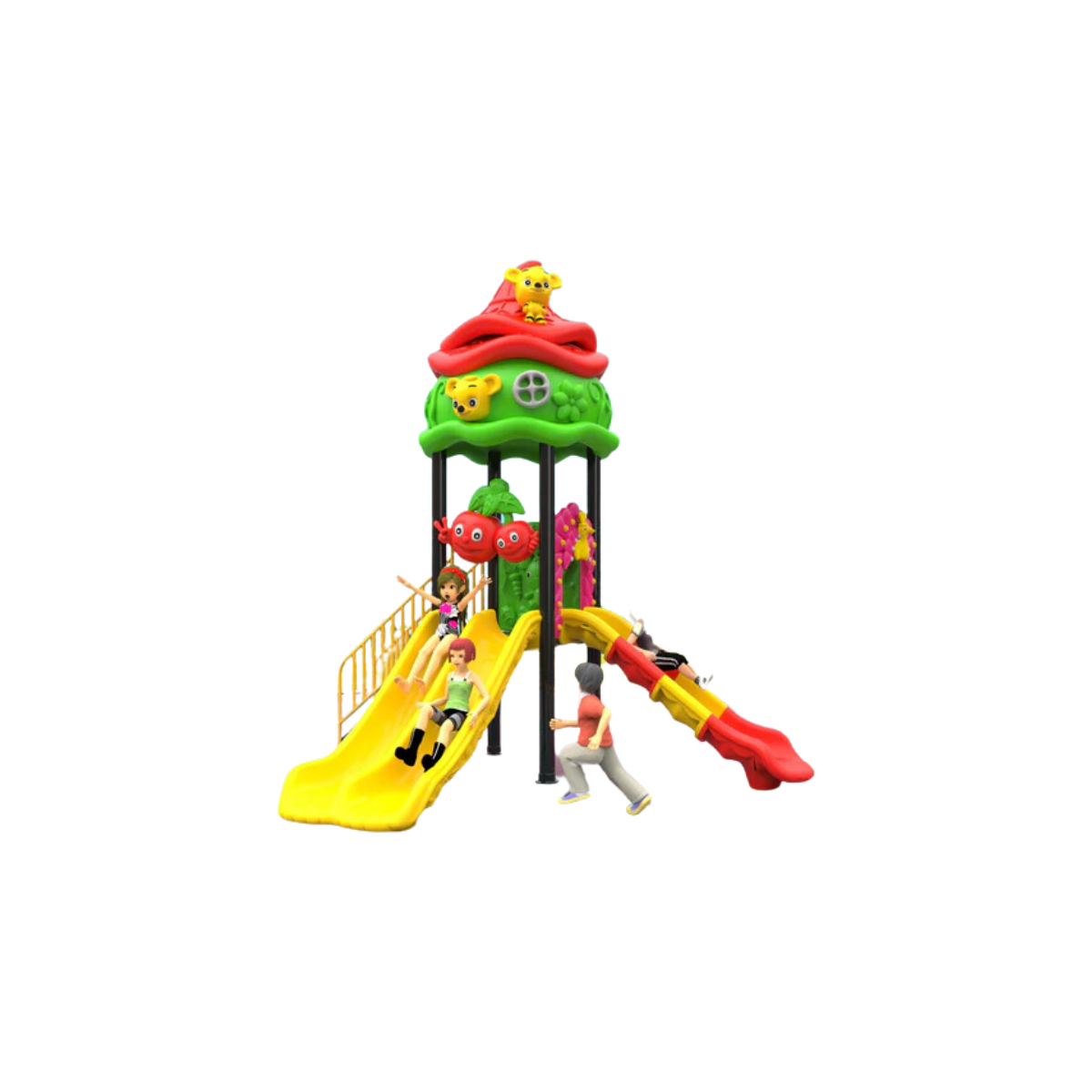 Medidas: 3.00 x 2.30 x 3.30 mts de alto Material: Estructura de acero y componentes de plástico rotomoldeado Edades: 3 a 10 años Capacidad: 3 a 5 niños Actividades que incluye: Resbaladilla sencilla, 1 resbaladilla doble, 1 escalera de acceso al juego y 1 techo.