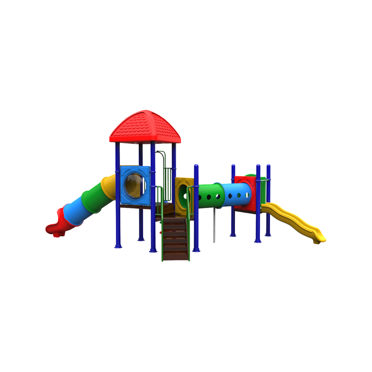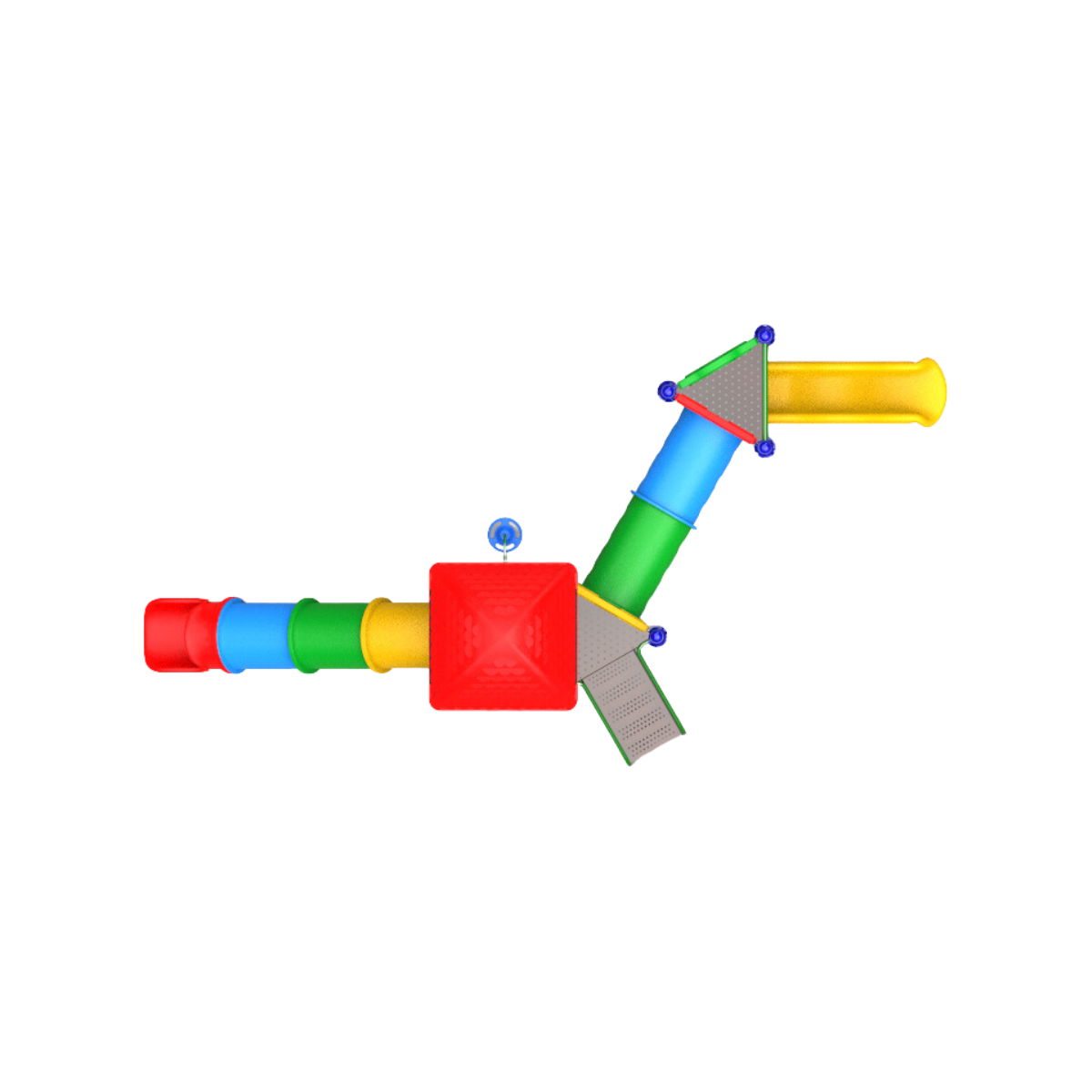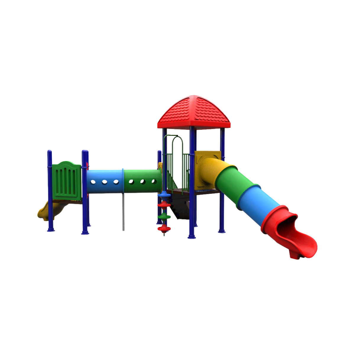 Actividades que incluye: Una resbaladilla sencilla junto con un tobogán cerrado, techo de cuatro aguas, tubo conector, y un trepador de discos.
