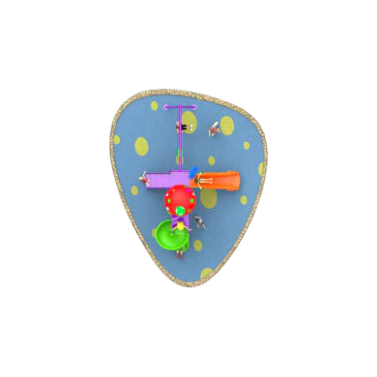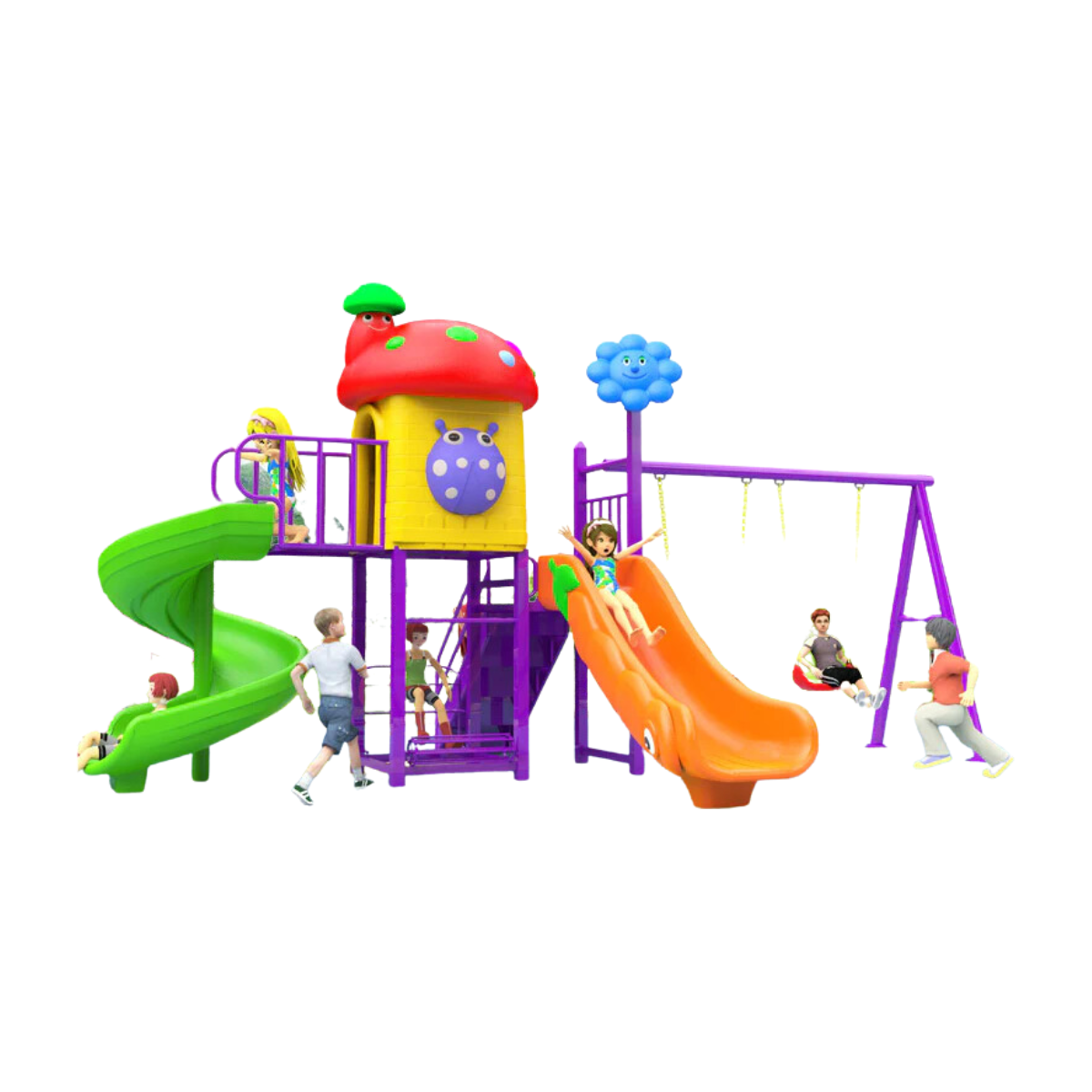 Actividades que incluye: 1 resbaladilla tipo caracol, 1 resbaladilla sencilla, 1 techo de casita hongo, 1 escalera de acceso, 2 columpios de banda y 1 panel.
