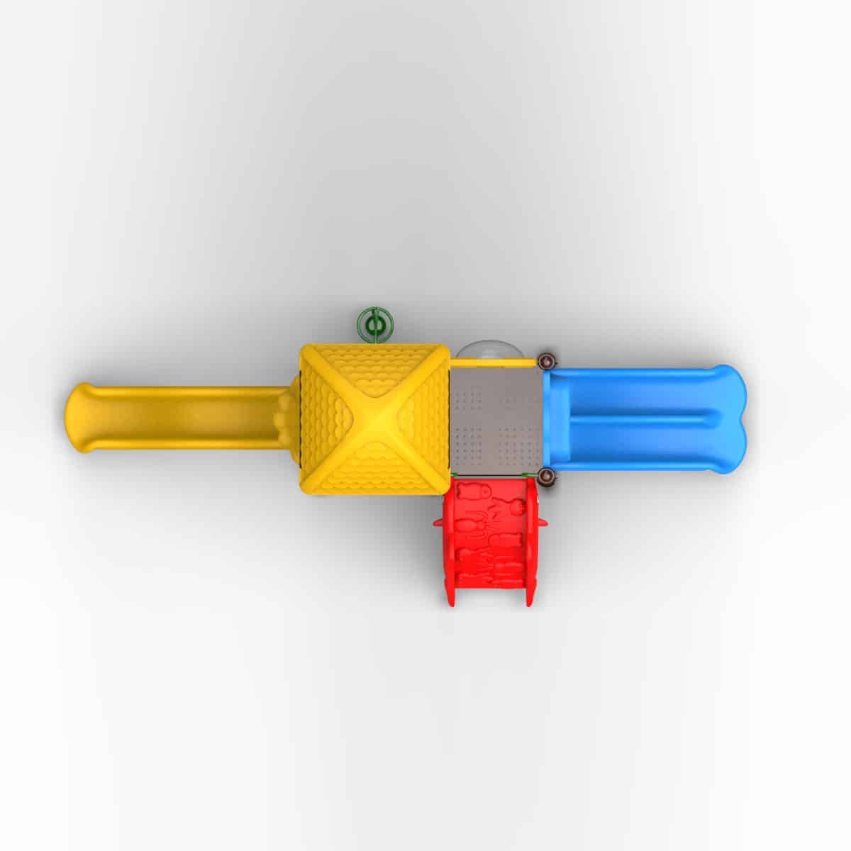 Juego híbrido tubular modular «Wall-E» fabricado con estructura de acero y componentes de plástico rotomoldeado, con terminación en pintura electrostática ideal para la intemperie.