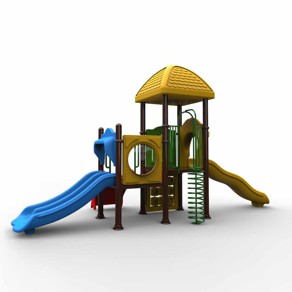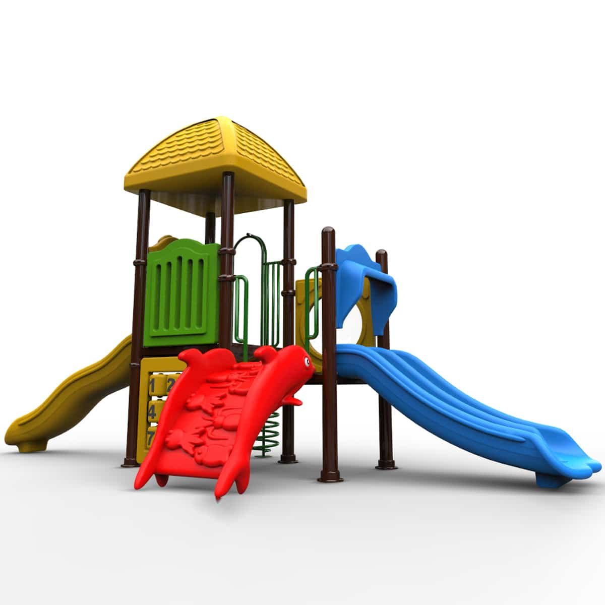 Medidas: 6.20 x 2.80 x 3.50 Material: Estructura de acero y componentes de plástico rotomoldeado Edades: 2 a 12 años Capacidad: 8 niños Actividades que incluye:
