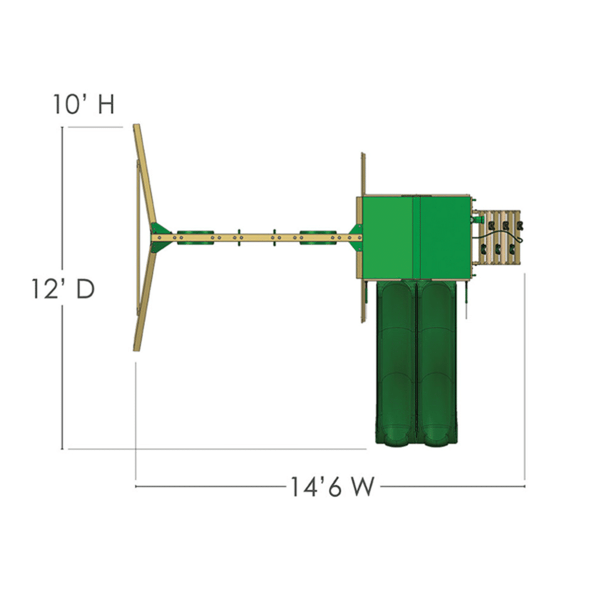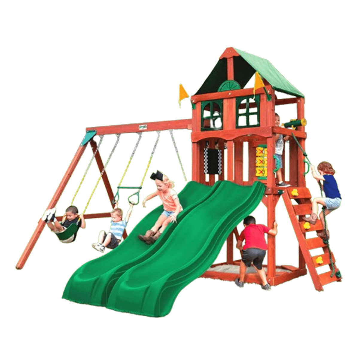 Juego infantil de madera tipo residencial con diseño compacto y funcional. Incluye resbaladilla doble, columpios, escalera, muro para escalar, volante y una pequeña casita elevada. Perfecto para patios traseros, jardines privados o áreas comunes en residencias. Estimula la actividad física, el equilibrio y el juego simbólico.