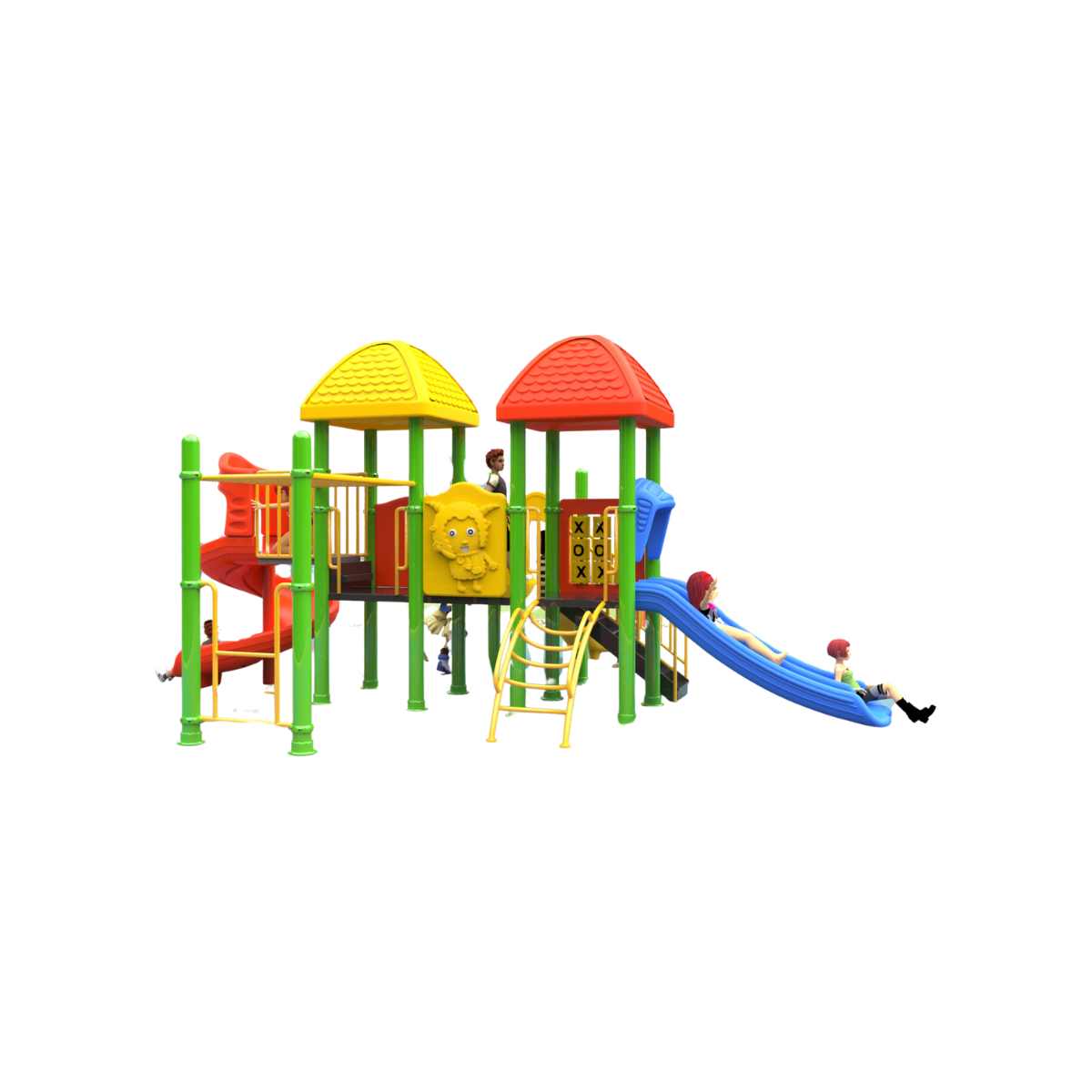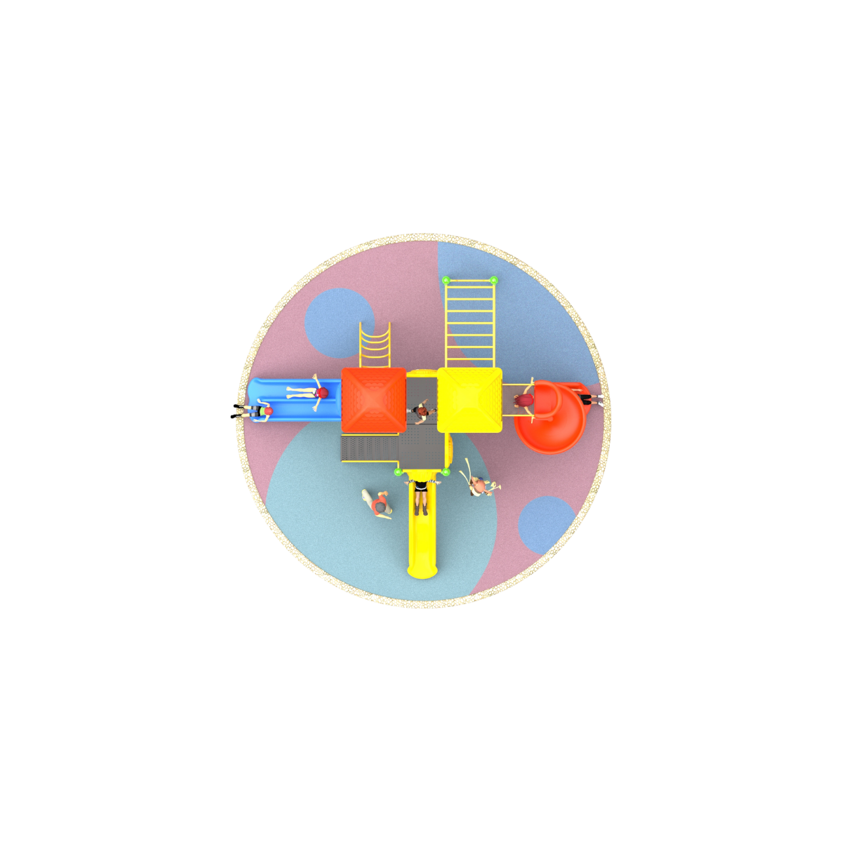 Medidas: 7.00 x 5.90 x 3.80 mts de alto Material: Estructura de acero y componentes de plástico rotomoldeado Edades: 4 a 11 años Capacidad: 12 niños Actividades que incluye: