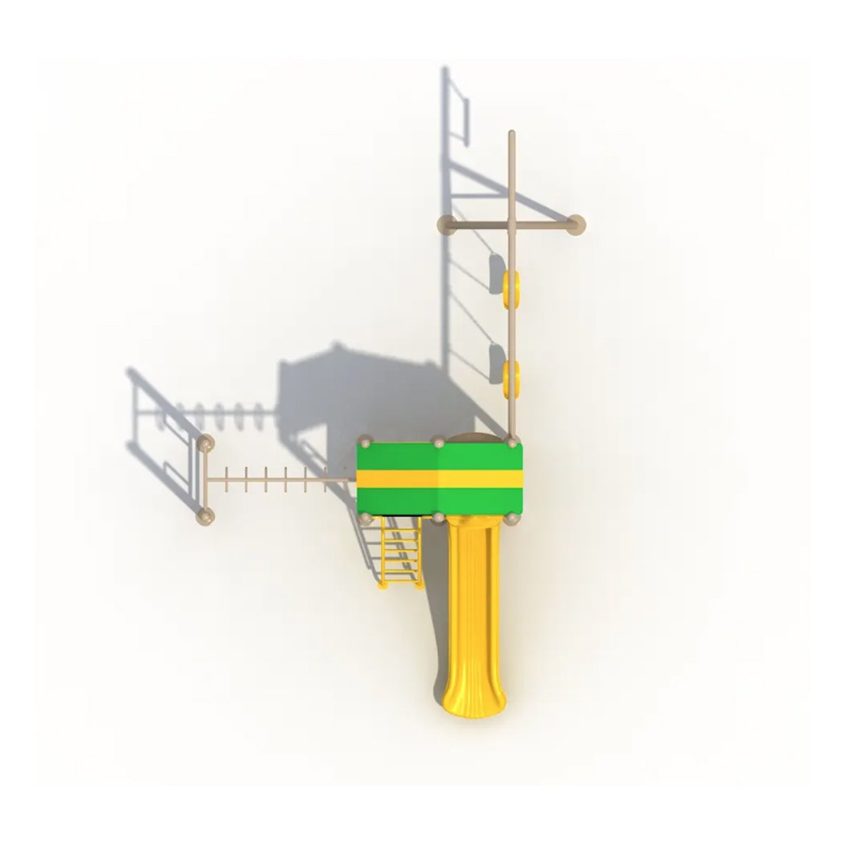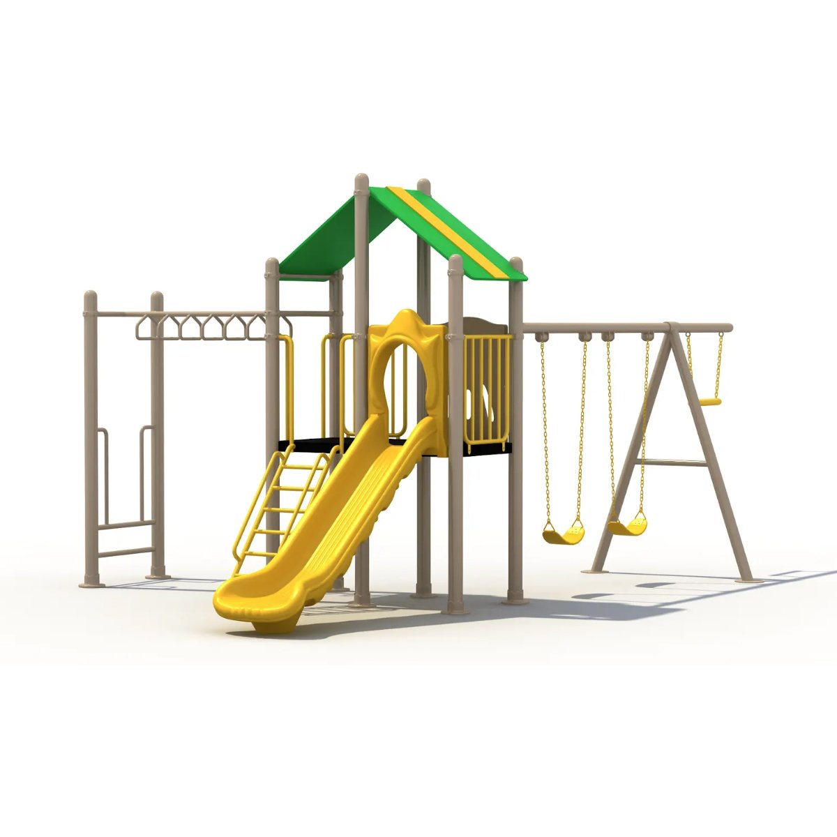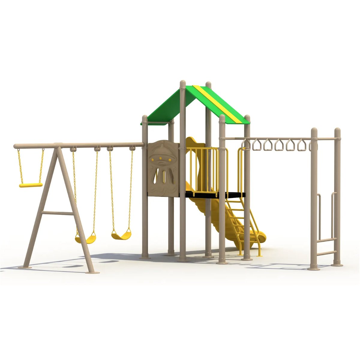Juego multi-actividades para intemperie. Compuesto por plataforma central con resbaladilla y techo, área de columpios y estructura con pasamanos. Fomenta la coordinación, fuerza y juego grupal para niños de 3 a 12 años.