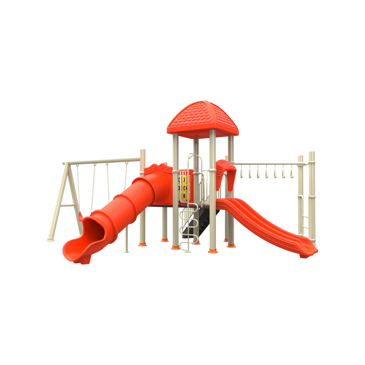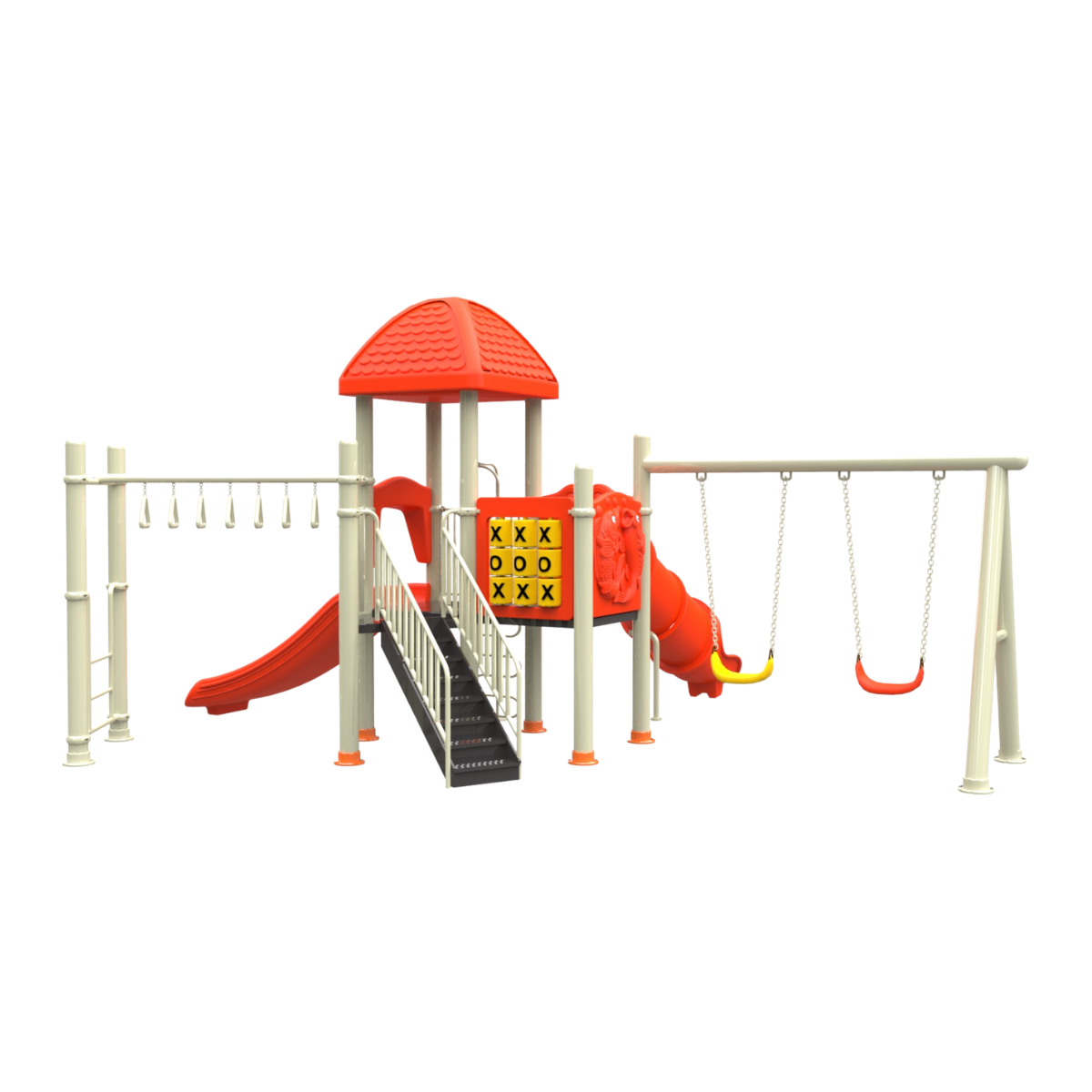 Medidas: 6.00 x 5.00 x 3.60 Material: Estructura de acero y componentes de plástico rotomoldeado, con terminación en pintura electrostática. Edades: 4 a 12 años Capacidad: 10 niños Actividades que incluye:
