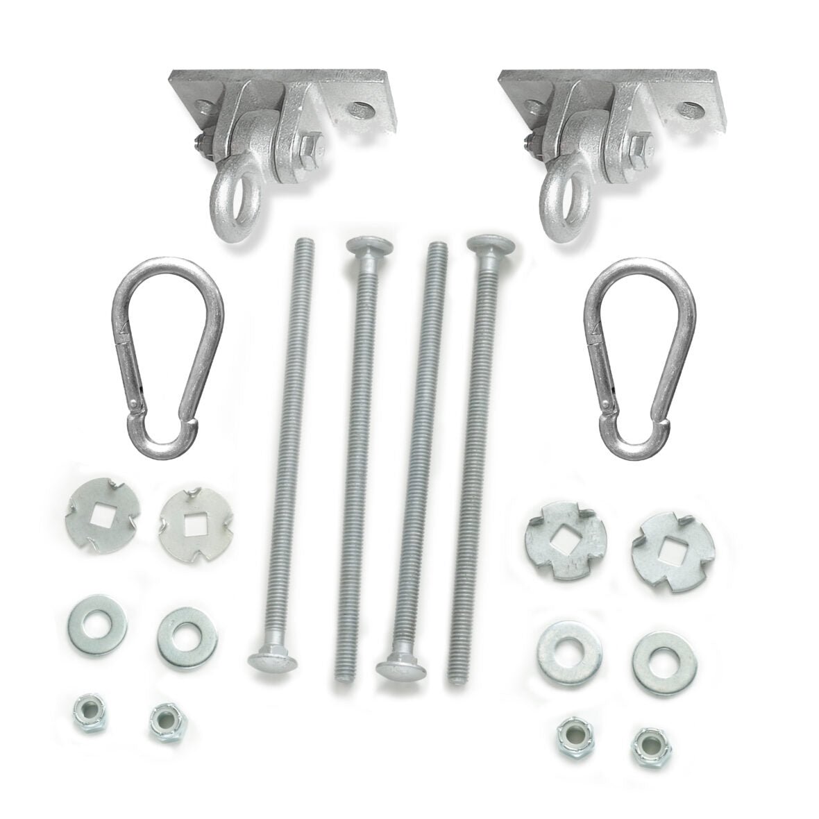 Fácil Instalación. Total Seguridad. Seguros, sólidos y extra resistentes, estos ganchos para columpios de servicio pesado son la elección perfecta para tu juego casero DIY o personalizado. Cada gancho para columpio está hecho de acero fundido, con cojinete de bronce y hardware de montaje de 2 pernos. Estos modelos súper fuertes están diseñados especialmente para su uso con nuestros asientos de columpio de servicio pesado y tienen un límite de peso de 250 lbs.