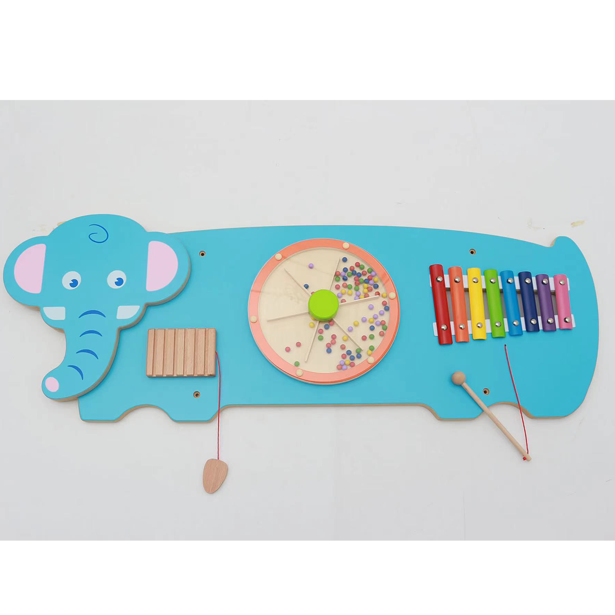 Actividades que incluye: Panel interactivo sensorial musical con 2 instrumentos de percusión y una rueda de abalorio.