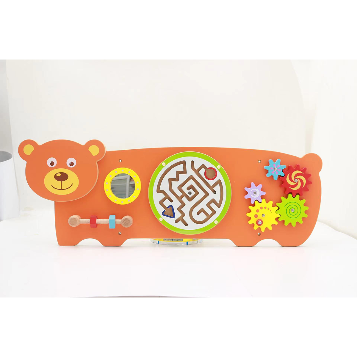 Panel interactivo sensorial con laberinto de abalorio giratorio, espejo, engranajes móviles y un hilo en espiral con tuercas de forma.